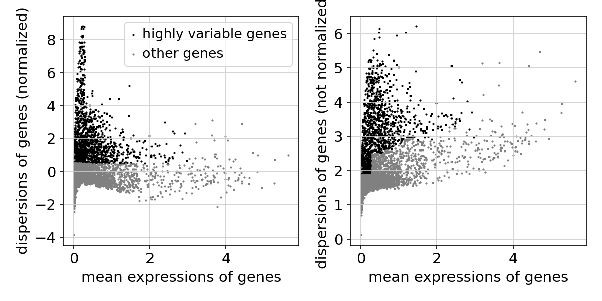 데이터를 정규화하고, 변동성이 높은 유전자를 선택한 뒤 시각화합니다 (Scatter plot).